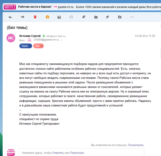 Добрый день, хотим поблагодарить Вашу компанию за предоставление отличного сервиса для поиска сотрудников и подбора персонала. Мы полностью удовлетворены качеством работы газеты "Рабочие места". Это и оперативный отчет о проделанной работе и согласованный выход наших объявлений и своевременное исправление ошибок. Хотим сказать большое человеческое спасибо Вашим менеджерам, особенно, Ефремовой Надежде, всегда веселой и отзывчивой...Надеемся на долгосрочное сотрудничество.