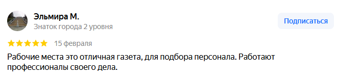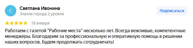 Постоянно размещаемся в газете «Рабочие места» - это самое распространяемое и известное издание о работе. С нашим менеджером Мариной С. работаем давно и очень довольны, она всегда вежлива и отзывчива. "Рабочие места"- это партнер, с которым удобно и эффективно сотрудничать! Желаем Вам дальнейшего развития и успехов!